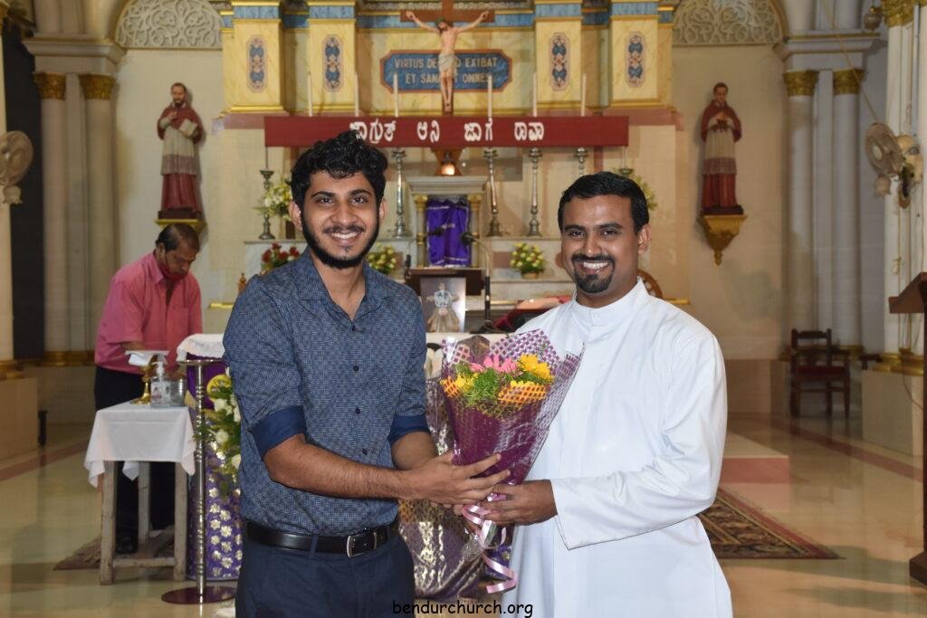 CAL president, Mr. Lynal Lewis and secretary, Ms. Amanda Frank, greeted Fr Ashwin with a bouquet of flowers. There was a short cake cutting program conducted by the CAL members after the 8 am mass, for which V.Rev.Fr Vincent Monteiro, Rev. Fr Nelson Peris, CAL animator Mr. Vinod D’Souza and the CAL members were also present.
