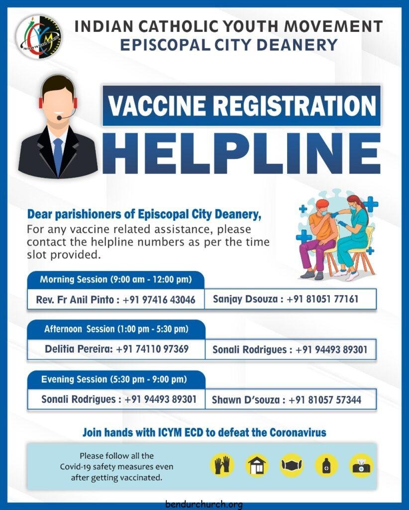 The members of ICYM Episcopal City Deanery have set up a vaccine registration helpline to assist the elderly parishioners who have difficulty in registering or booking an appointment for the Covid-19 vaccine. This helpline is also for vaccine related queries. They will be carrying out this mission under the guidance of medical professionals.