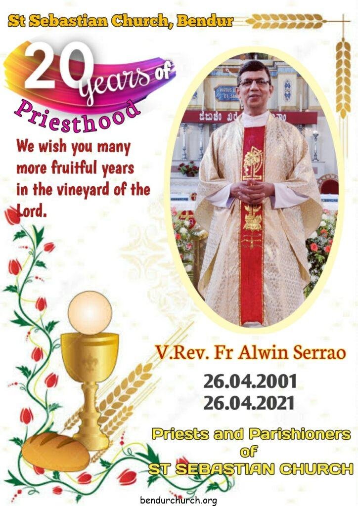 Ordination Day Anniversary Wishes to V.Rev. Fr. Alwyn Serrao April 26, 2021 by editor Congratulations to V.Rev. Fr. Alwyn Serrao on his 20th Ordination Day Anniversary.